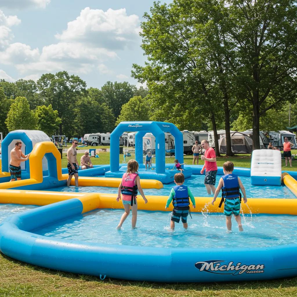 Kid-friendly activities at Michigan family campgrounds combine water play, river floats, playgrounds, and structured events to suit a wide range of ages and energy levels. Activity-rich sites use inflatable obstacle courses, swimming lakes, river canoe trips, and on-site game zones to provide varied stimulation and easy supervision, which helps parents rotate children through safe, supervised options. These activities promote physical play, confidence in water, social skills through group events, and low-prep entertainment for busy caregivers. Below is a short list of the most common high-value activities families should look for when comparing Michigan campgrounds.