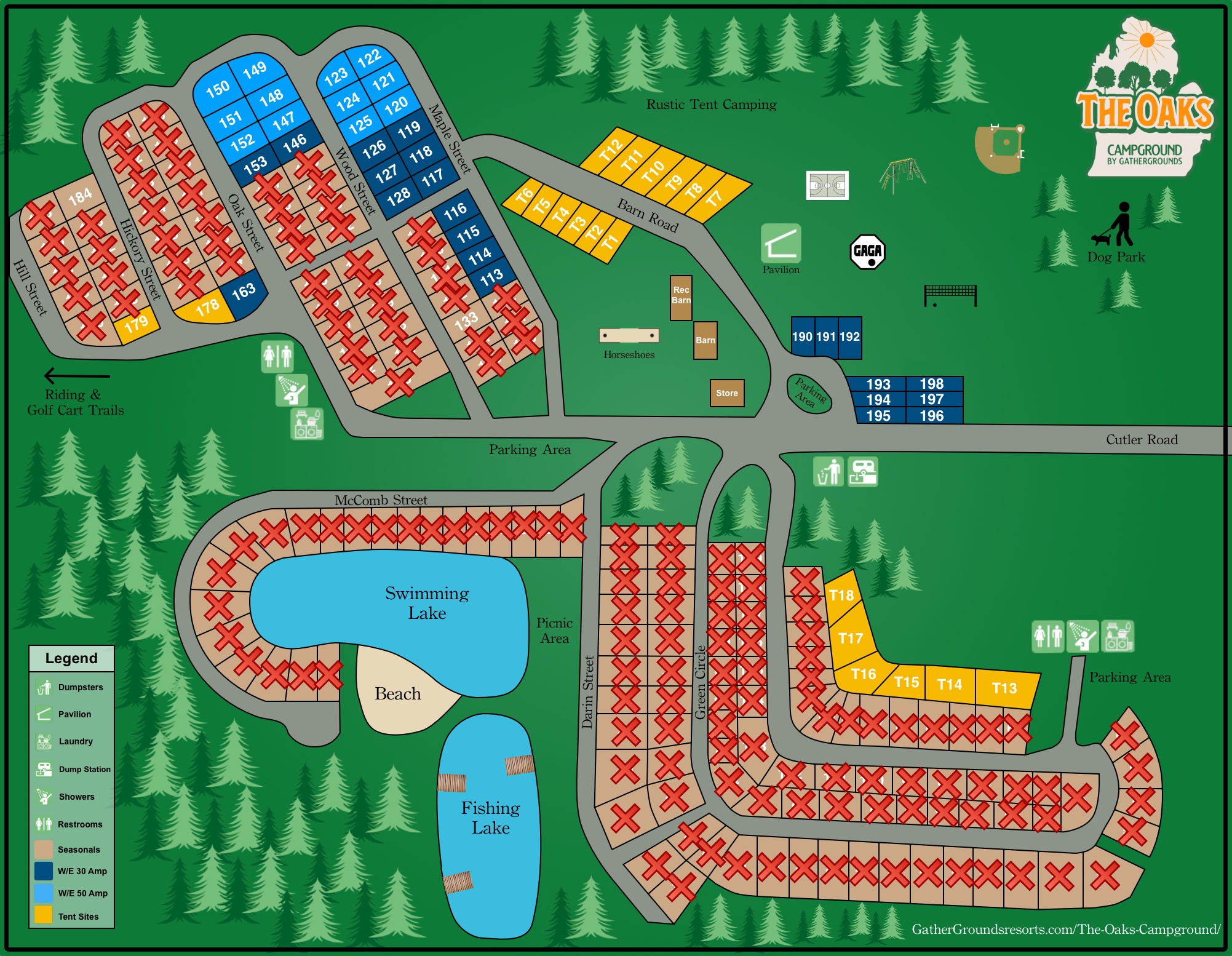Seasonal site availability at The Oaks varies throughout the year based on individual agreement expiration dates. If sites are not renewed, they will be reflected on the map below for new customers to reserve. If you’re looking to secure a seasonal site right away, we invite you to explore availability at our sister campground, Walnut Hills Family Campground, located just one hour north. Click here to see their seasonal site availability map: Walnut Hills Seasonal Sites